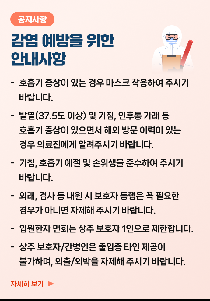 외래 진료 시간, 24시간 응급진료, 병원 입퇴원 절차를 안내해 드립니다.